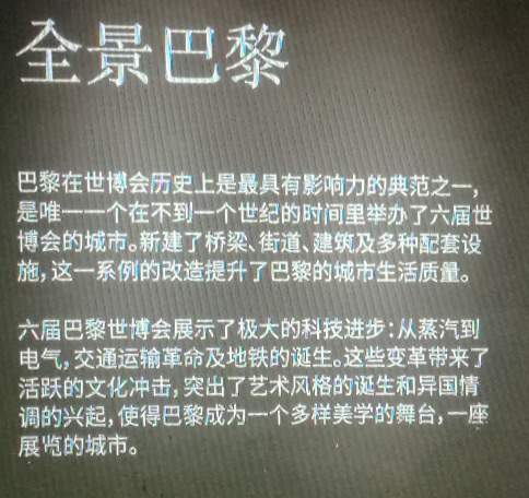 来到一号展厅,首当其冲映入眼帘的是“寰宇舞台”四个大字的铭碑,右边是万国世博会的模型,很大,可以想象出当时的盛貌与辉煌。深入展厅,你会看见“全景巴黎”的字样,介绍了巴黎是在不到一个世纪的时间里举办六次世博会的城市。