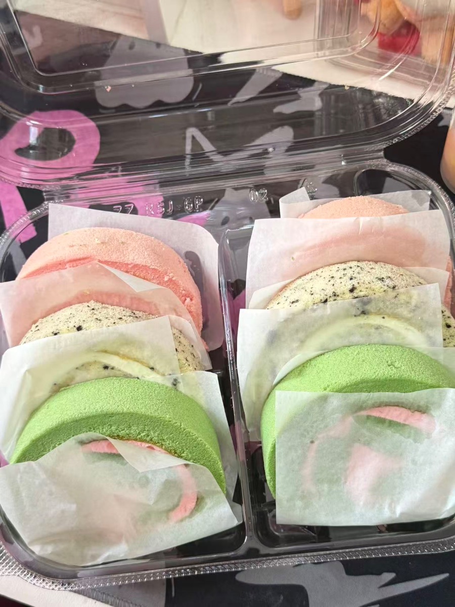 透明餐盒里的瑞士卷像被揉碎的彩虹,粉、白、绿三色卷身裹着薄透的油纸,软乎乎地挨在一起。粉色卷是草莓味,蓬松的蛋糕体裹着清甜奶油,咬开时会沾得嘴角都是甜香;中间的芝麻卷带着焦香,细密的芝麻粒嵌在蛋糕里,每一口都有颗粒感的惊喜;抹茶卷最是清爽,微苦的茶味裹着绵密内馅,中和了甜腻。它们软得像刚晒过的棉花,拿在手里轻轻一捏就陷下去,却又能立刻弹回蓬松的模样,光是看着这柔和的色彩,连空气都跟着变得甜软起来,是能把疲惫都揉化的下午茶甜物。