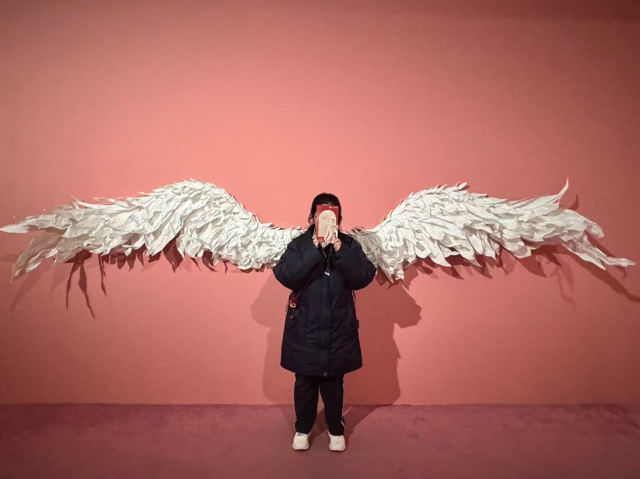 “快站过去!”同学推着我上前。我背对墙站好,翅膀正好从身后展开。朋友举着手机指挥:“头稍微偏一点,对!别笑太开,要那种随意的感觉。”快门声咔嚓咔嚓,她拍了好几张。换我帮她拍时,她张开双臂作飞翔状,发丝被风吹起,还真像要飞起来。
