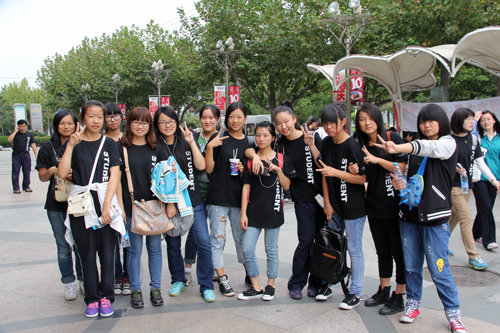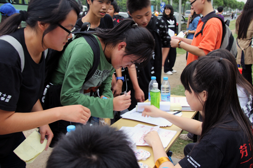走近操场,真可谓是“黑压压”的一片---身着黑色、印有“跋涉六十里,走向大学城”字样T恤的学生与老师正三五成群地凑在一起或认真察看学校下发的路线图,或讨论着马上将开行的最佳方案。向往、期盼、兴奋、激动之情溢于每个人的言表。