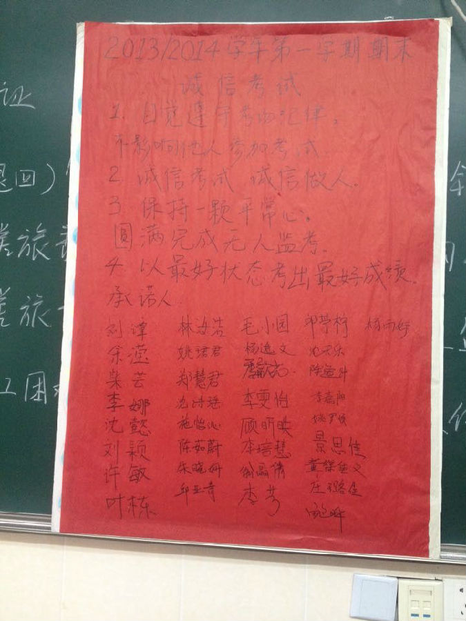 本学期初,会计131班延续上个学期的传统,申请施行无人监考。为了能够申请成功,会计131班同学们准备了签名、承诺书,宣誓等。
