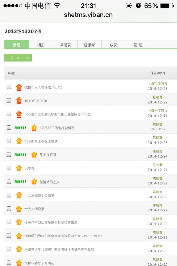 初识易班对易班并没有什么好感,因为作为班主任会有很多的担心,同时也没让我感觉易班的优越性所在,因为很多事情我都能通过qq来做,出于无奈而使用了易班,但用下来居然觉得它真不错,我和同学们又多了一个交流的平台,和同学们又多了交流的话题,每天易班都会有不同的活动主题,而网站所设立的网薪,经验值,排名又增加了同学们的竞争意识。
